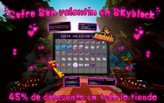 Hola y muy buenas, agradecerles por el apoyo que nos siguen brindando hasta hoy a nuestro servidor. Queremos también desearle un San Valentin lleno de alegría y felicidad, pero no viene solo, viene con un descuento de hasta un 45% de descuento en toda nuestra tienda Online y la llegada de la crate VALENTINE´S a la modalidad de Skyblock, esperamos que sea de su agrado.